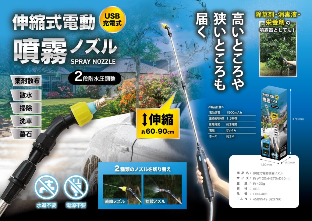 USB充電式の伸縮電動噴霧ノズルです。60-90cmまで伸縮し、2段階水圧調整と直噴・拡散ノズルの切り替えが可能。薬剤散布、散水、掃除、洗車など多用途に対応し、高所や狭所での作業も楽々。