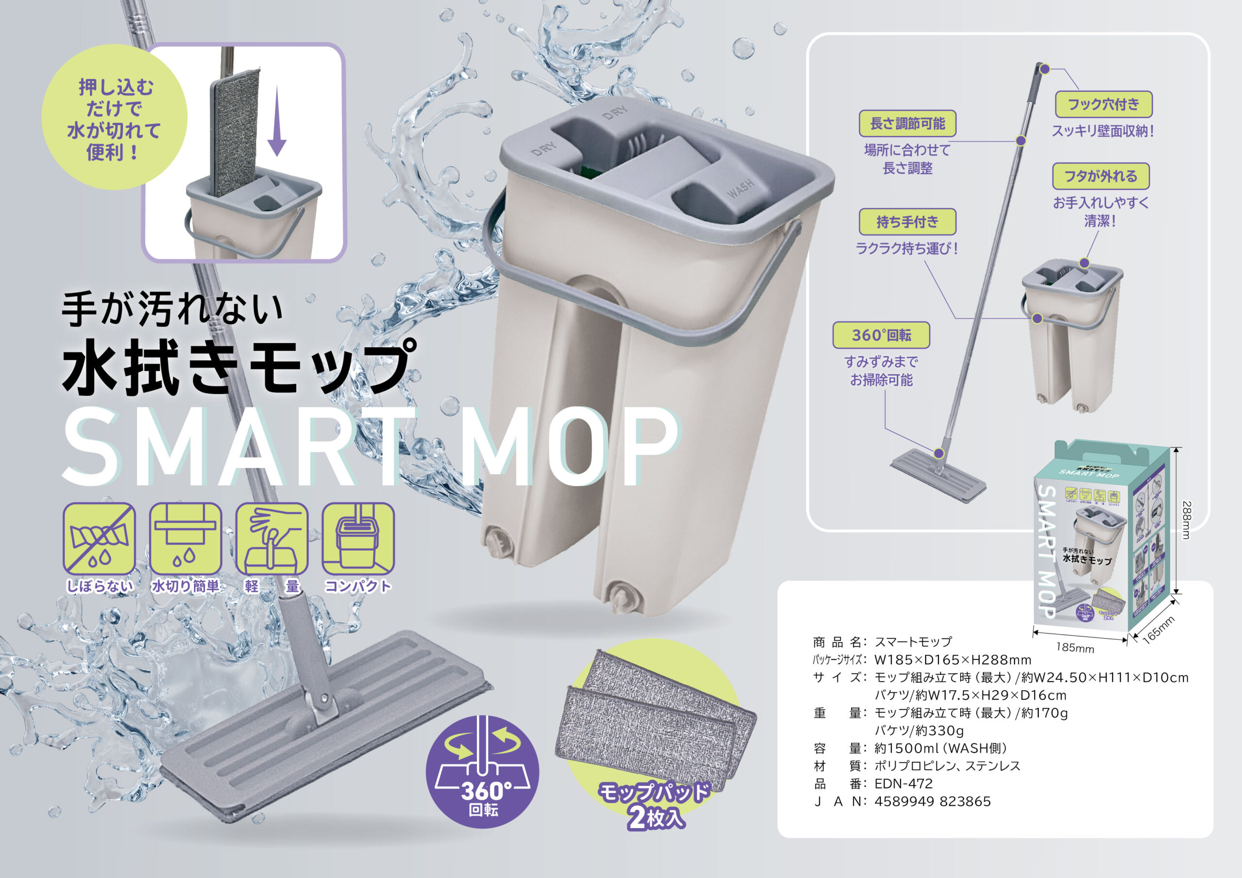手が汚れない水拭きモップ「SMART MOP」は、押し込むだけで水が切れる構造と、WASH/DRYの2槽バケツで簡単に洗浄と脱水ができるモップです。モップは360°回転し、すみずみまでお掃除が可能で、長さ調節やフック穴付きなど使いやすさを考えた設計になっています。軽量でコンパクトなため、持ち運びや収納もラクに行えます。
