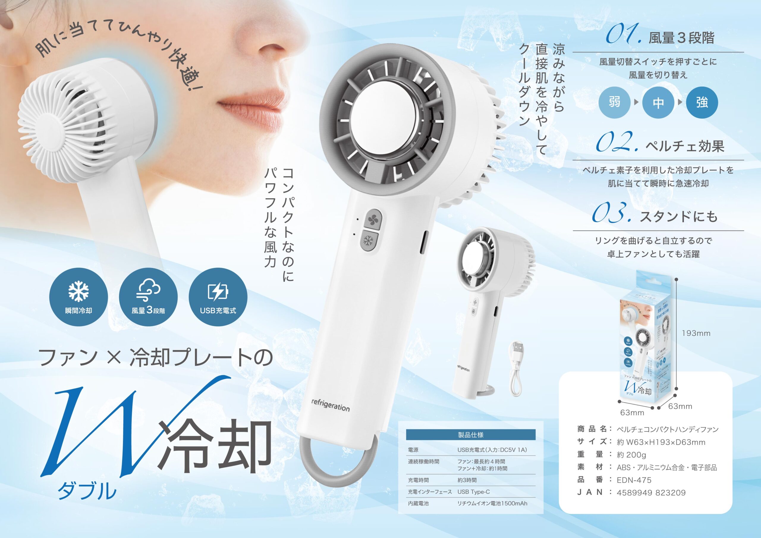 ファン×冷却プレートのW冷却で、肌に当ててひんやり快適なペルチェコンパクトハンディファンです。コンパクトなのにパワフルな風力で、風量は弱・中・強の3段階に切り替えられます。ペルチェ素子を利用した冷却プレートを直接肌に当てることで瞬時に急速冷却し、リングを曲げて自立させれば卓上ファンとしても使用できます。