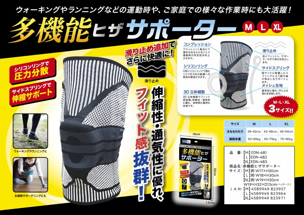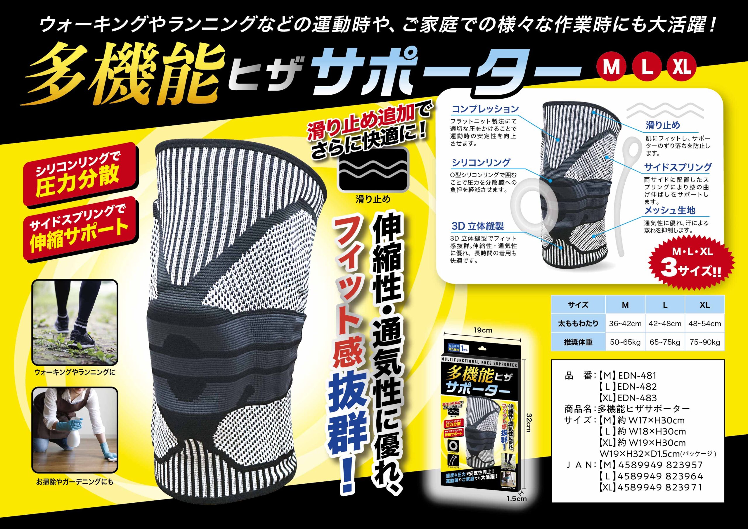 ウォーキングやランニングなどの運動時や、ご家庭での様々な作業時にも大活躍する多機能ヒザサポーターです。シリコンリングで圧力分散し、サイドスプリングで伸縮サポートを実現、さらに滑り止め追加で快適に使用できます。伸縮性・通気性に優れ、フィット感抜群の設計が特長です。M・L・XLの3サイズ展開です。