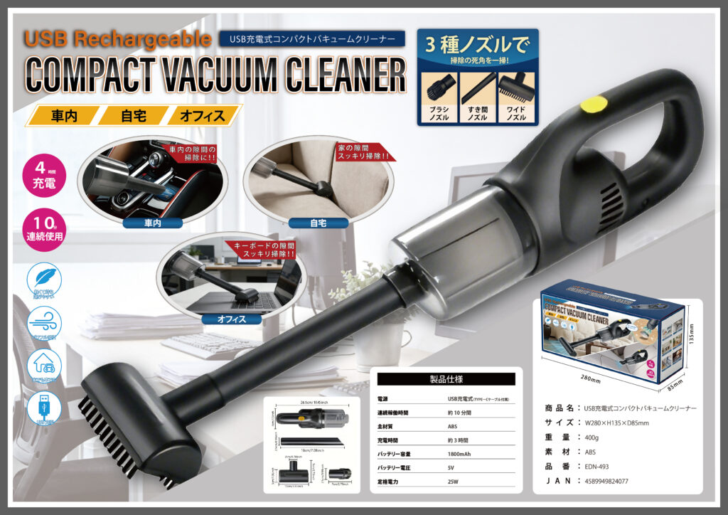 USB Rechargeable COMPACT VACUUM CLEANER」は、USB充電式のコンパクト掃除機で、車内・自宅・オフィスなどのさまざまな場所の清掃に対応します。ブラシノズル・すき間ノズル・ワイドノズルの3種類のノズルが付属し、細かな隙間やキーボード、車内の掃除にも使用できます。約10分の連続使用が可能で、軽量設計のため持ち運びやすいクリーナーです。